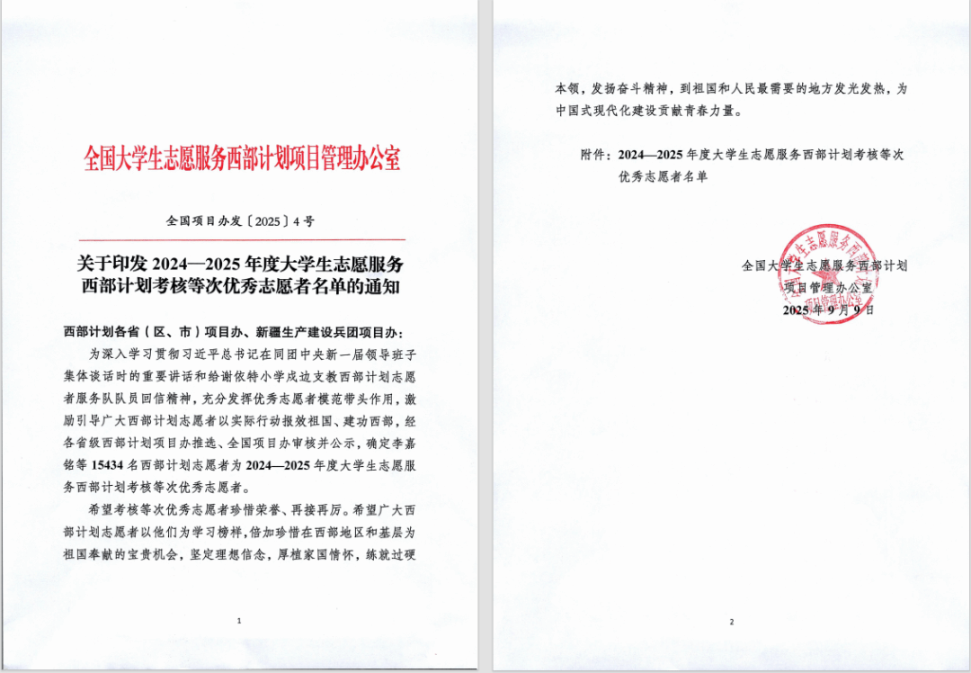 近日,全国大学生志愿服务西部计划项目管理办公室发布《2024-2025年度大学生志愿服务西部计划考核等次优秀志愿者名单公示》,我系2名大学生志愿服务西部计划志愿者获评全国西部计划考核等次优秀!