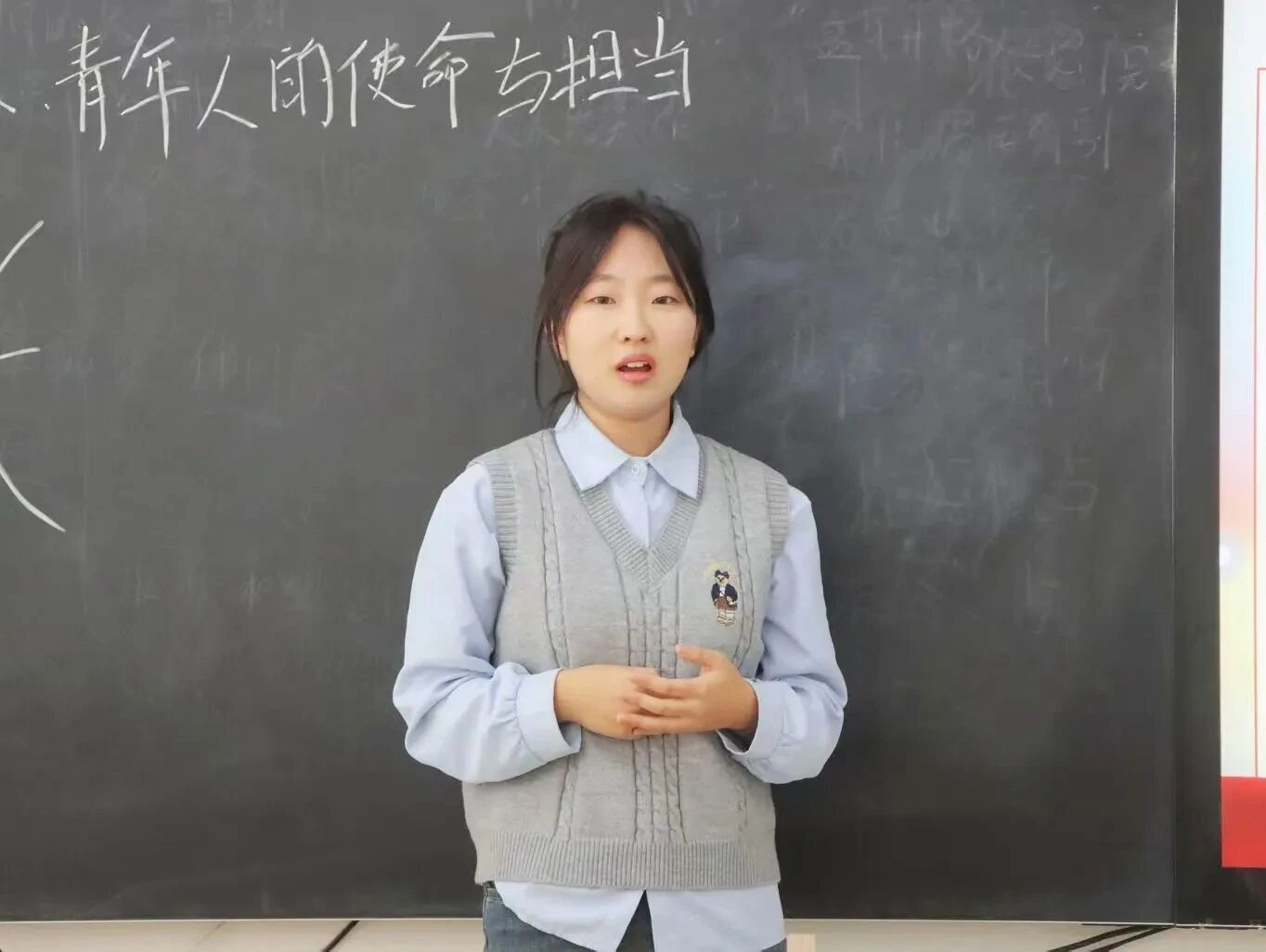 小教2301班王美婷同学的主讲课题是《中国近代史纲要》——遵义会议。学前2501班张哲宁同学的主讲课题是《育时代新人,从“我”到“我们”,青年人的使命与担当》。