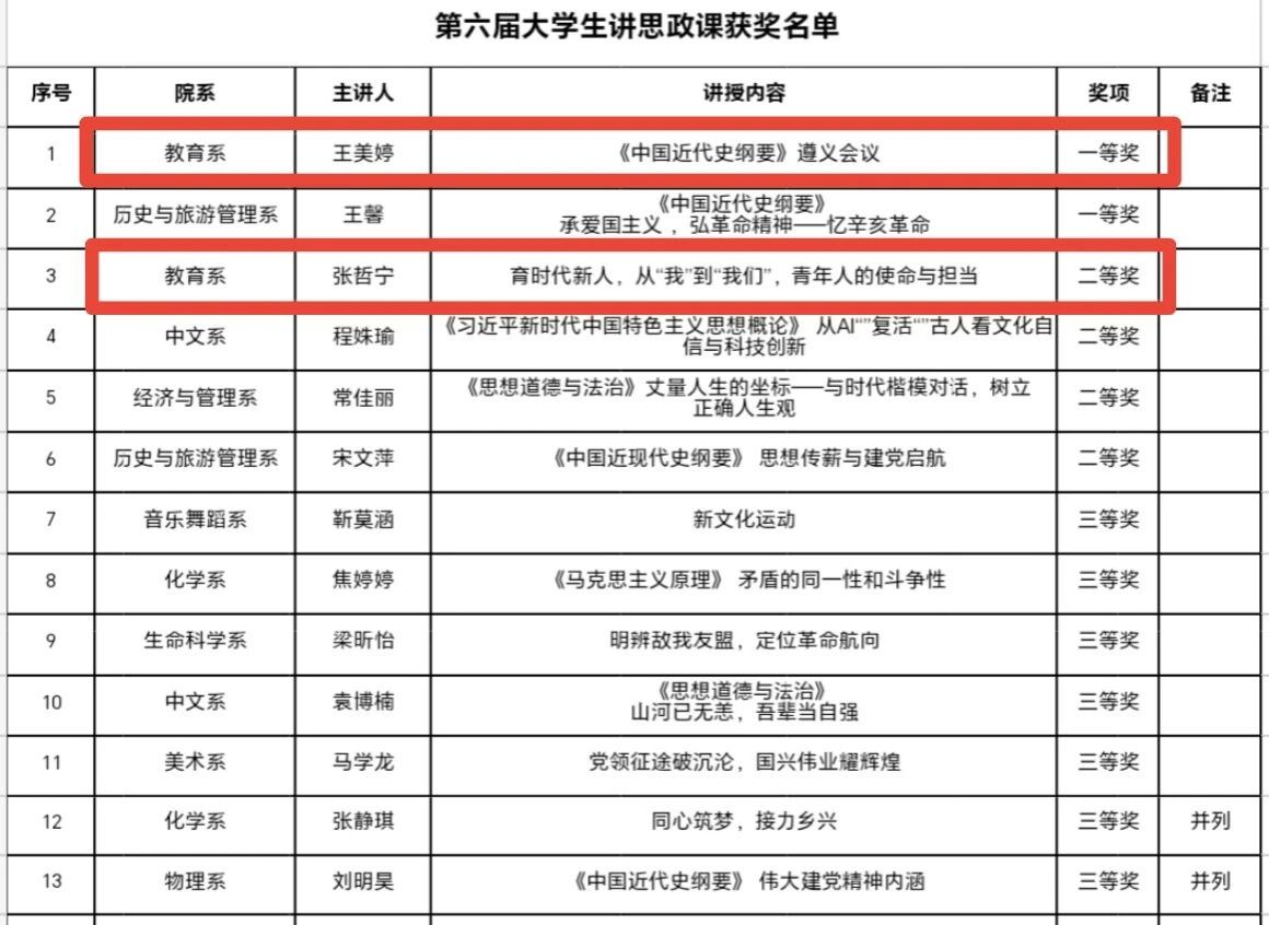 为深入学习贯彻习近平总书记关于学校思政课建设的重要讲话和重要指示批示精神,长治学院举行了第六届"大学生讲思政课"公开课比赛。此次大赛中,我系小教2301班王美婷、杨堃,学前2302班武慧如三名同学荣获一等奖;学前2501班张哲宁、车思颖、佀绣三名同学荣获二等奖。